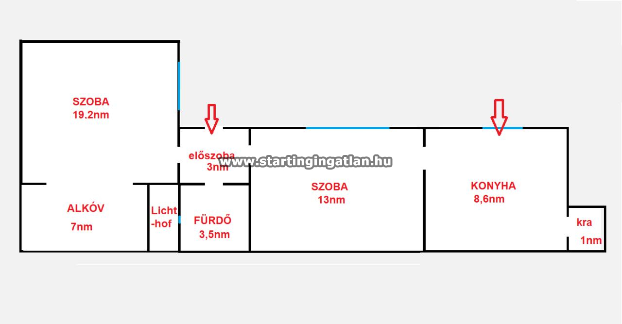 A lakás jelenlegi elrendezése két külön nyíló szobát és egy alkóvot tartalmaz, így kiváló lehetőség akár saját otthonnak, akár befektetési célra. A 3,4 méteres belmagasság tágas érzetet biztosít, és lehetőséget ad galéria kialakítására is. Korábban két bejárattal rendelkezett, így igény esetén akár két különálló garzonlakássá is átalakítható. Az ingatlan teljes felújítást igényel, cserébe viszont a leendő tulajdonos saját igényei és ízlése szerint alakíthatja ki álmai otthonát, vagy kiadható ingatlanjait.
